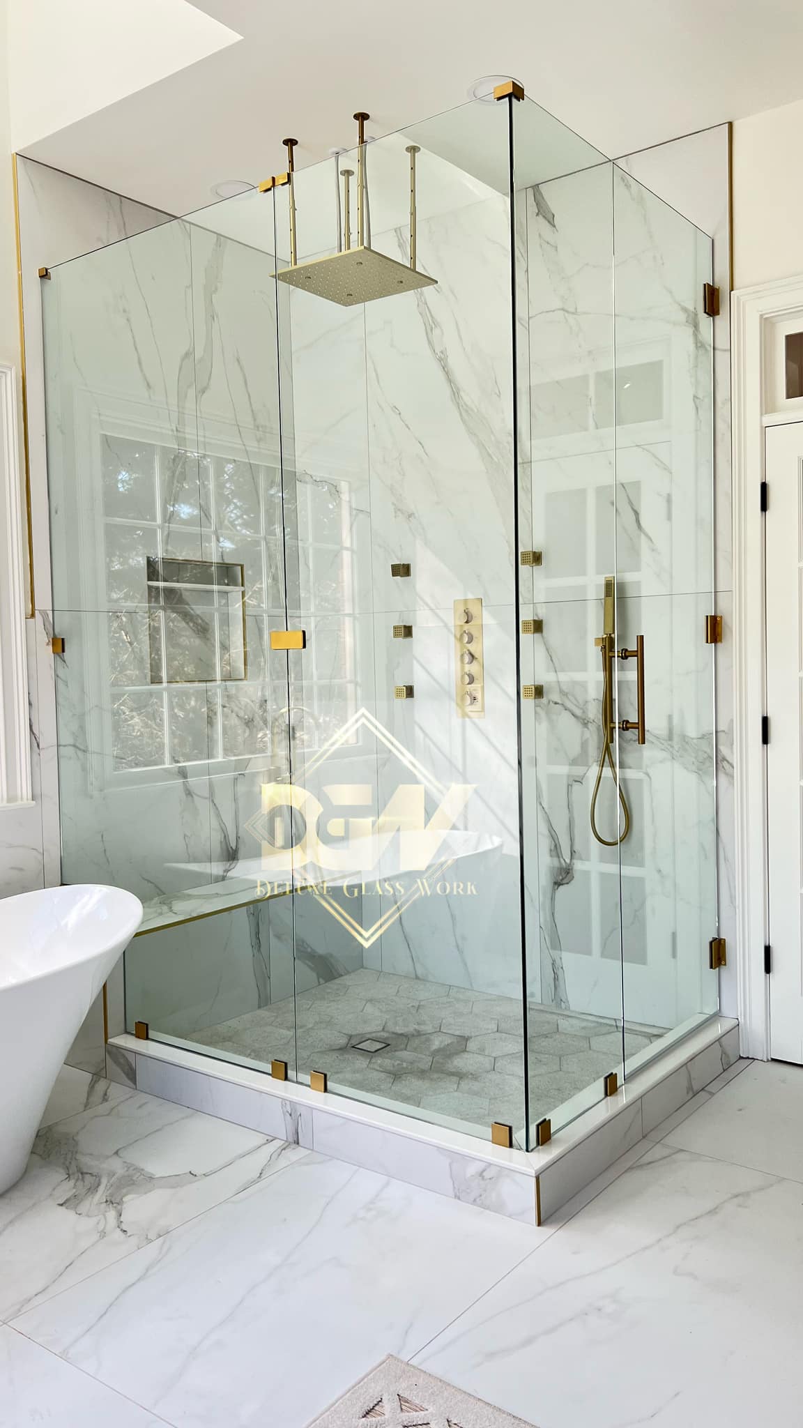 Low iron/ultra clear glass, 3/8” high polished with certified brushed nickel hardware.